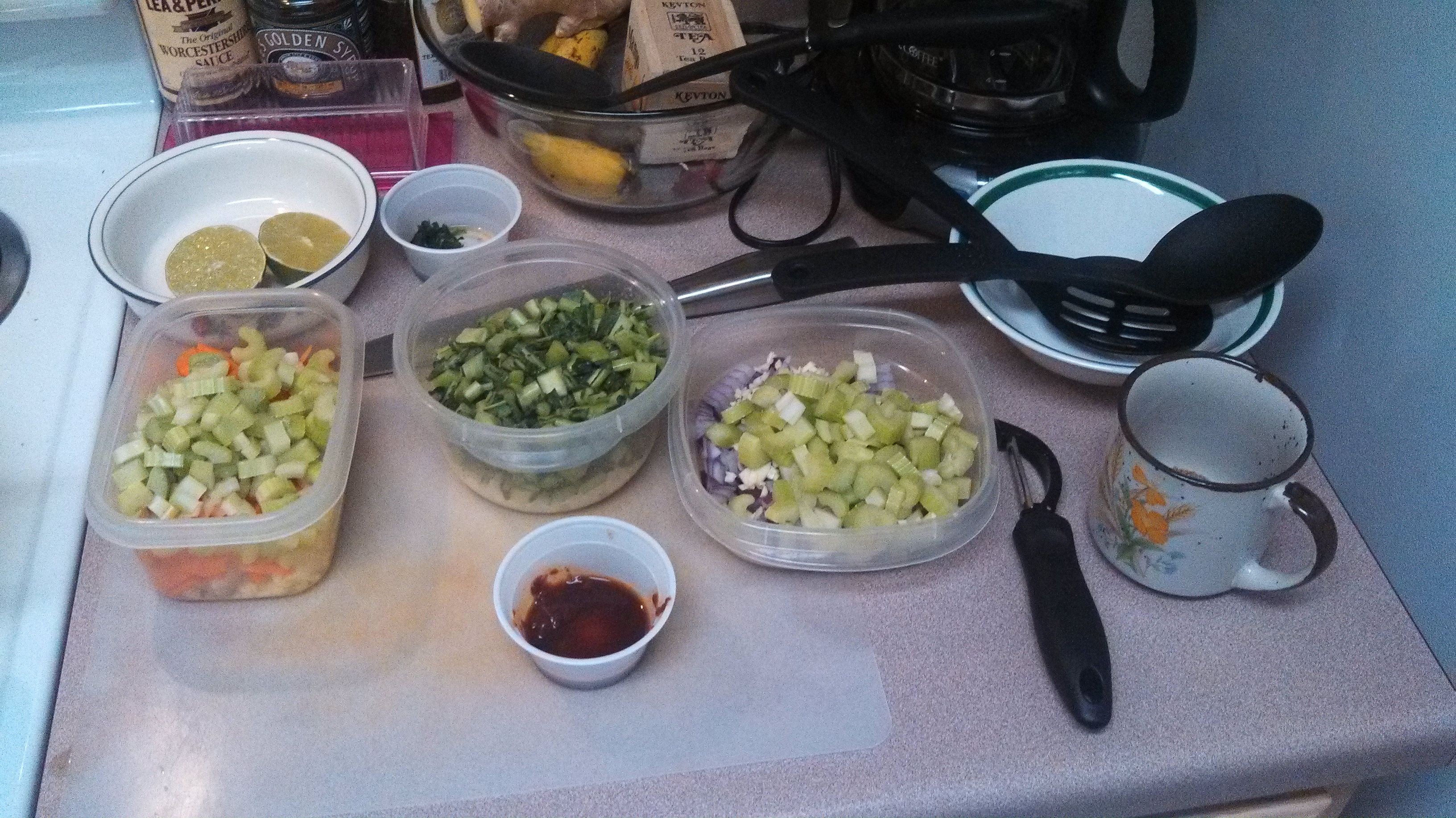 Lime, parsley, the aromatics for each soup, adobo sauce, herbs, and three different stirring spoons at the ready.