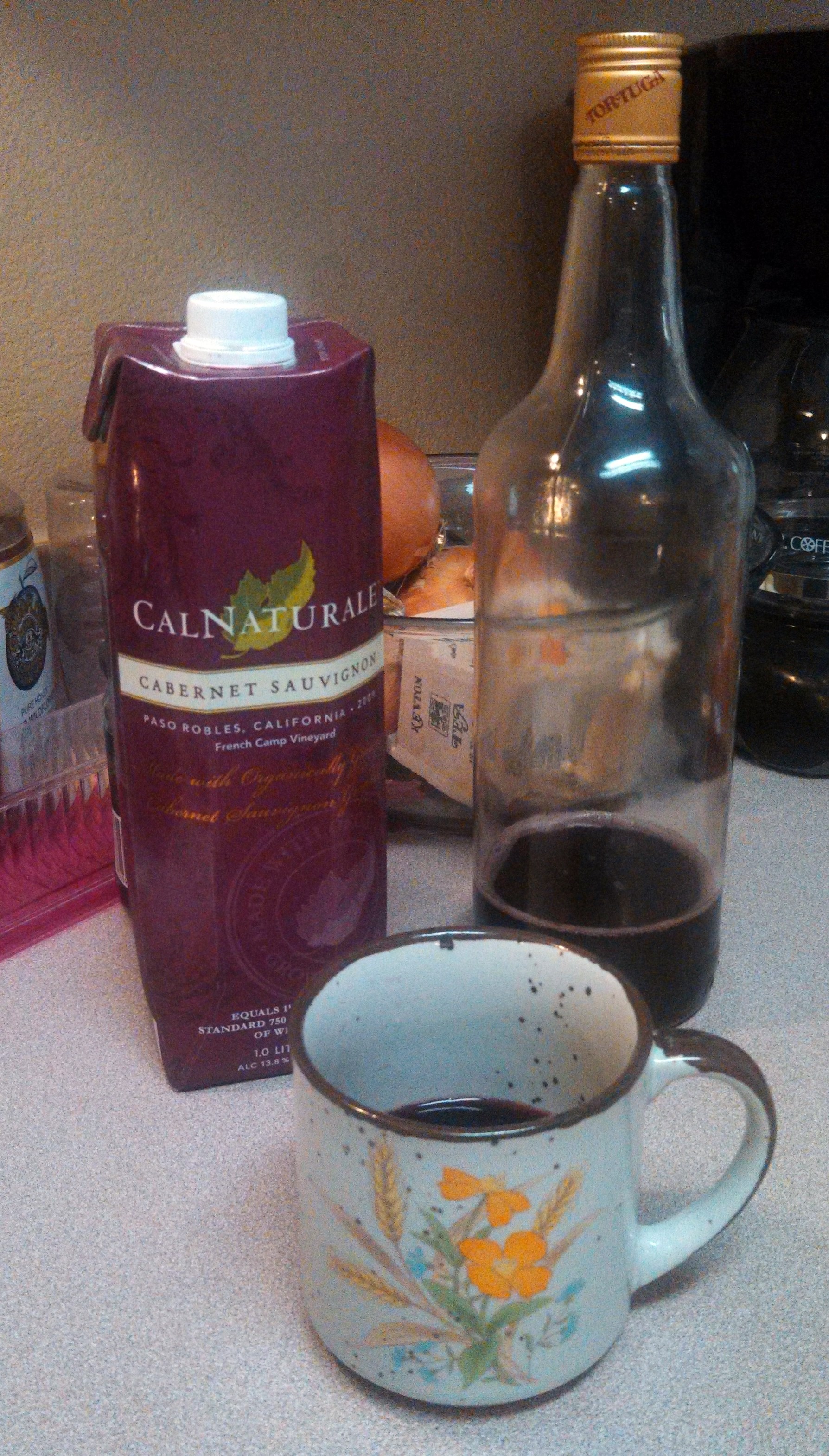 This was super easy.  I’d picked up a boxed (!!!) wine on sale at HEB the other day, after doing some research on what if any brands of boxed wines are legit.  I’d really like to support any decent quality boxed wines since it’s way better environmentally-speaking, glass being heavy and fragile and thus less than ideal to ship.  Anyway, CalNaturale came up in my search and it was on sale, so, yes, into my basket it went.  It was decent to drink on its own, nothing special, though not completely undrinkable.  Still, it was vastly helped by the addition of orange and cinnamon and brandy.