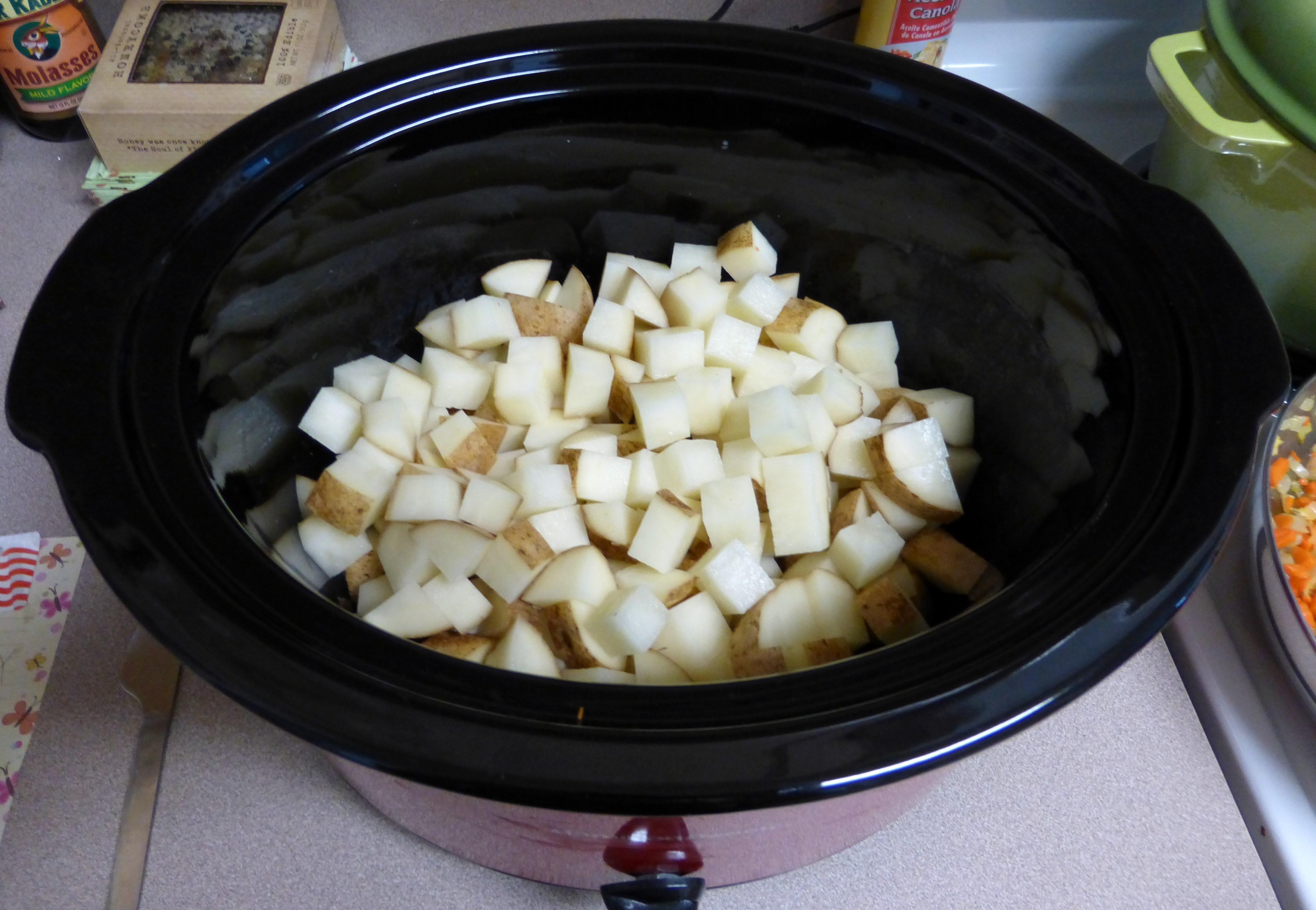 Cut the top third off of a head of garlic. Save the top third for another use. Remove any loose papers from the outside, but leave the head intact. Add it to the slow cooker.