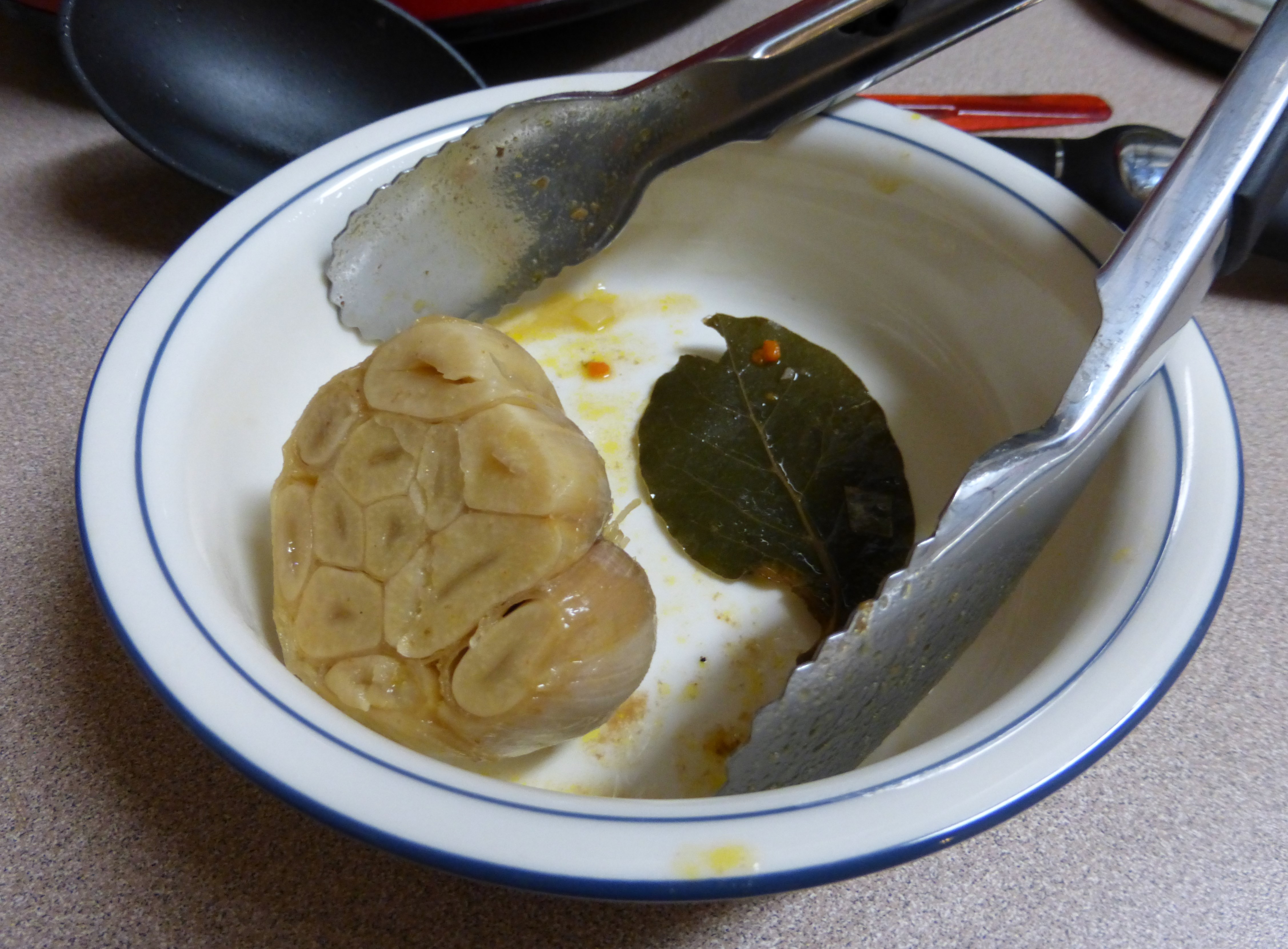 Once cooking is complete, add salt to taste. Remove the bay leaf and head of garlic. Squeeze the braised cloves out of the their skins, and mash into a paste. Return as much of this garlicky paste to the slow cooker as desired.