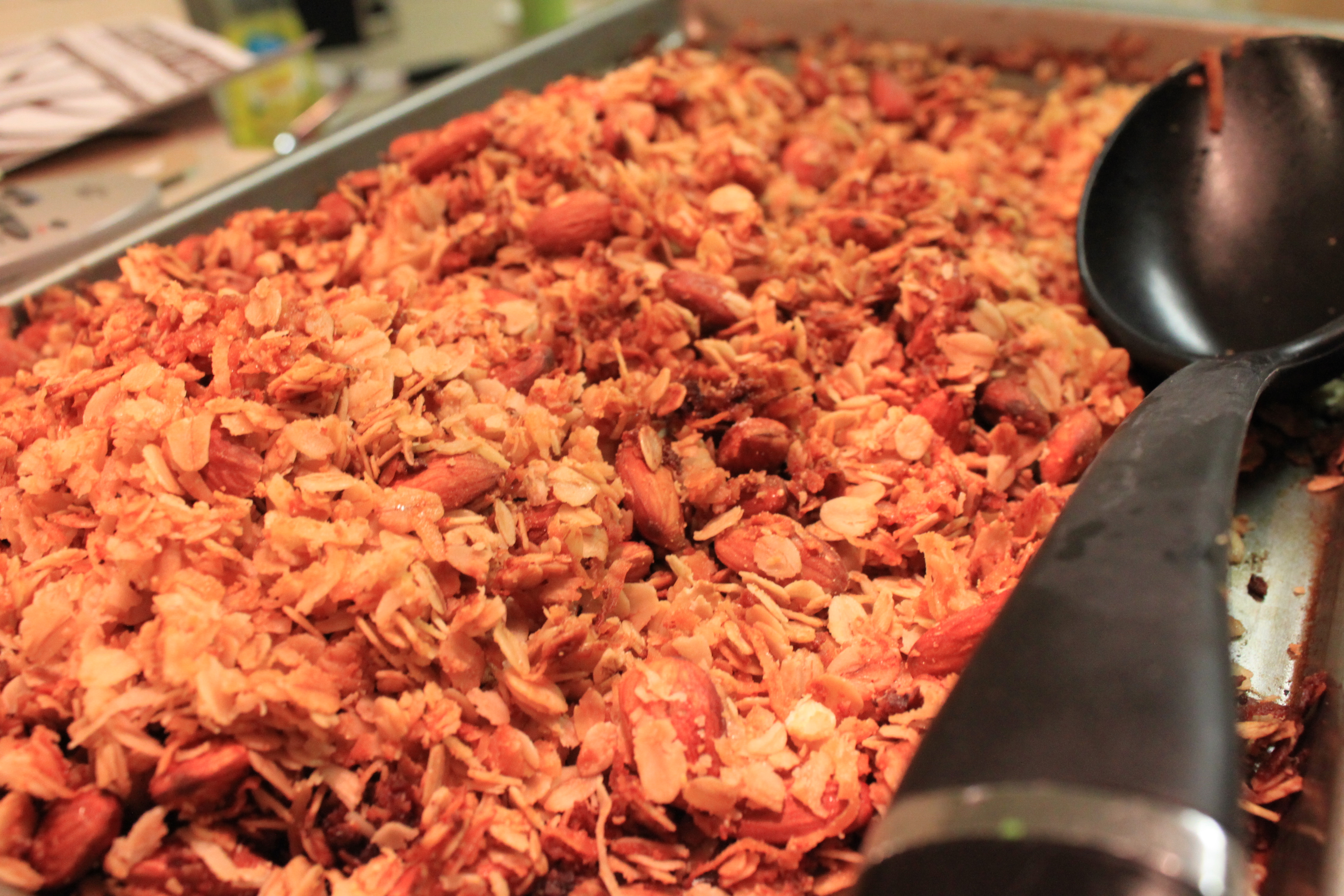 (4) Spread across several cookie sheets and bake. Stir things up every five minutes or so to ensure it cooks evenly. Granola is done when it just begins browning. It will crunch up once it has set out a little while. You can always put it back in if it needs more time.