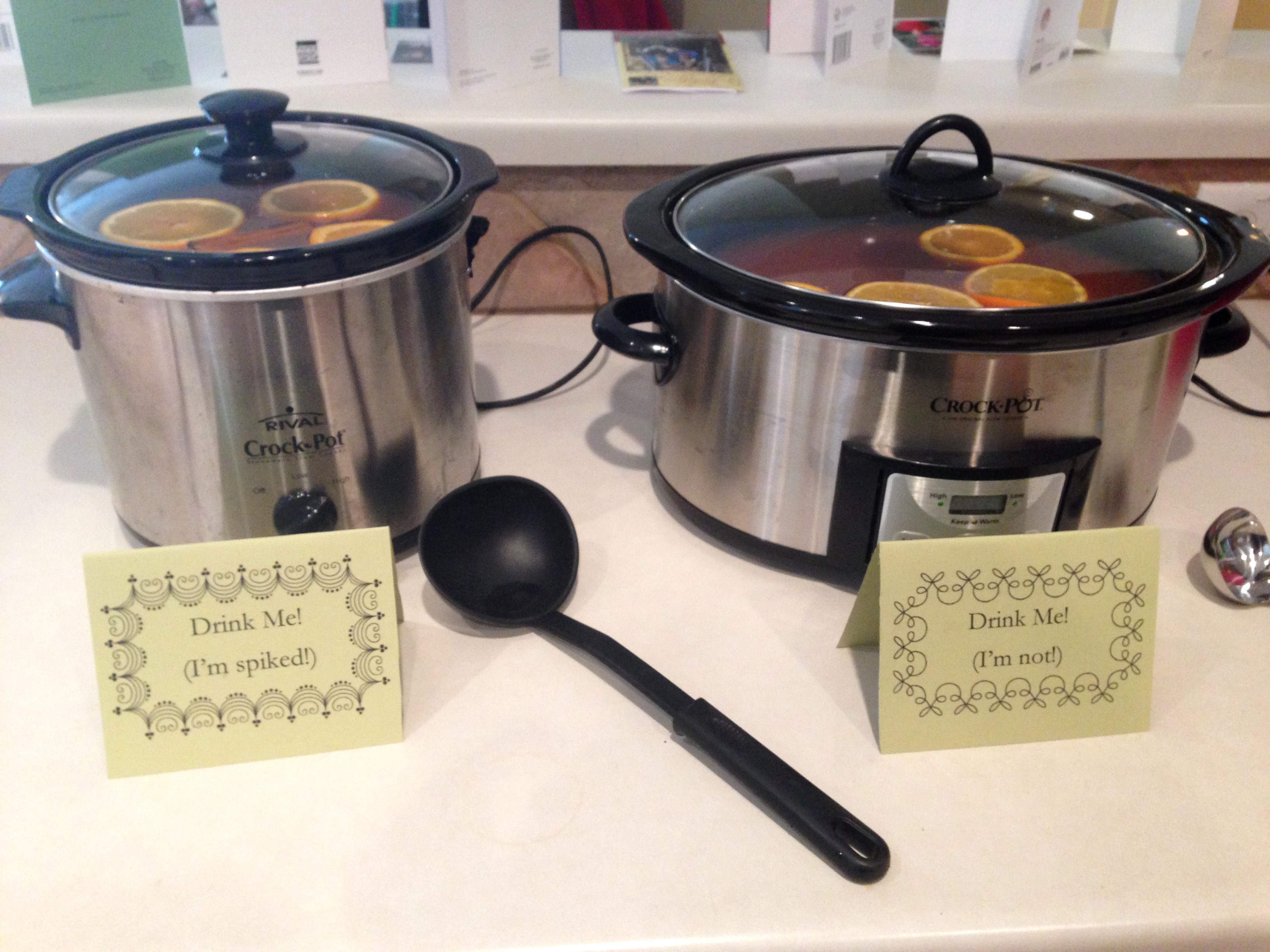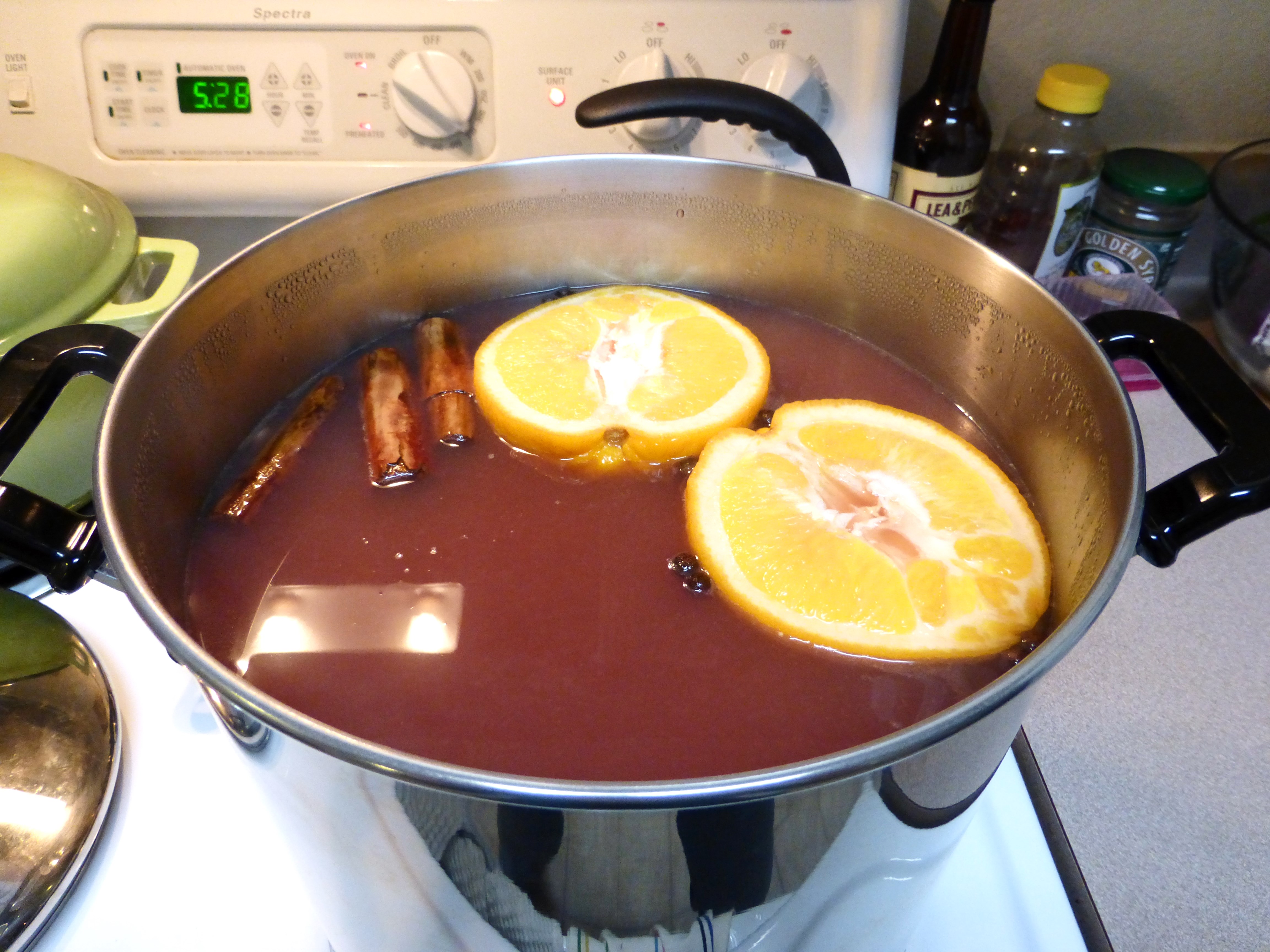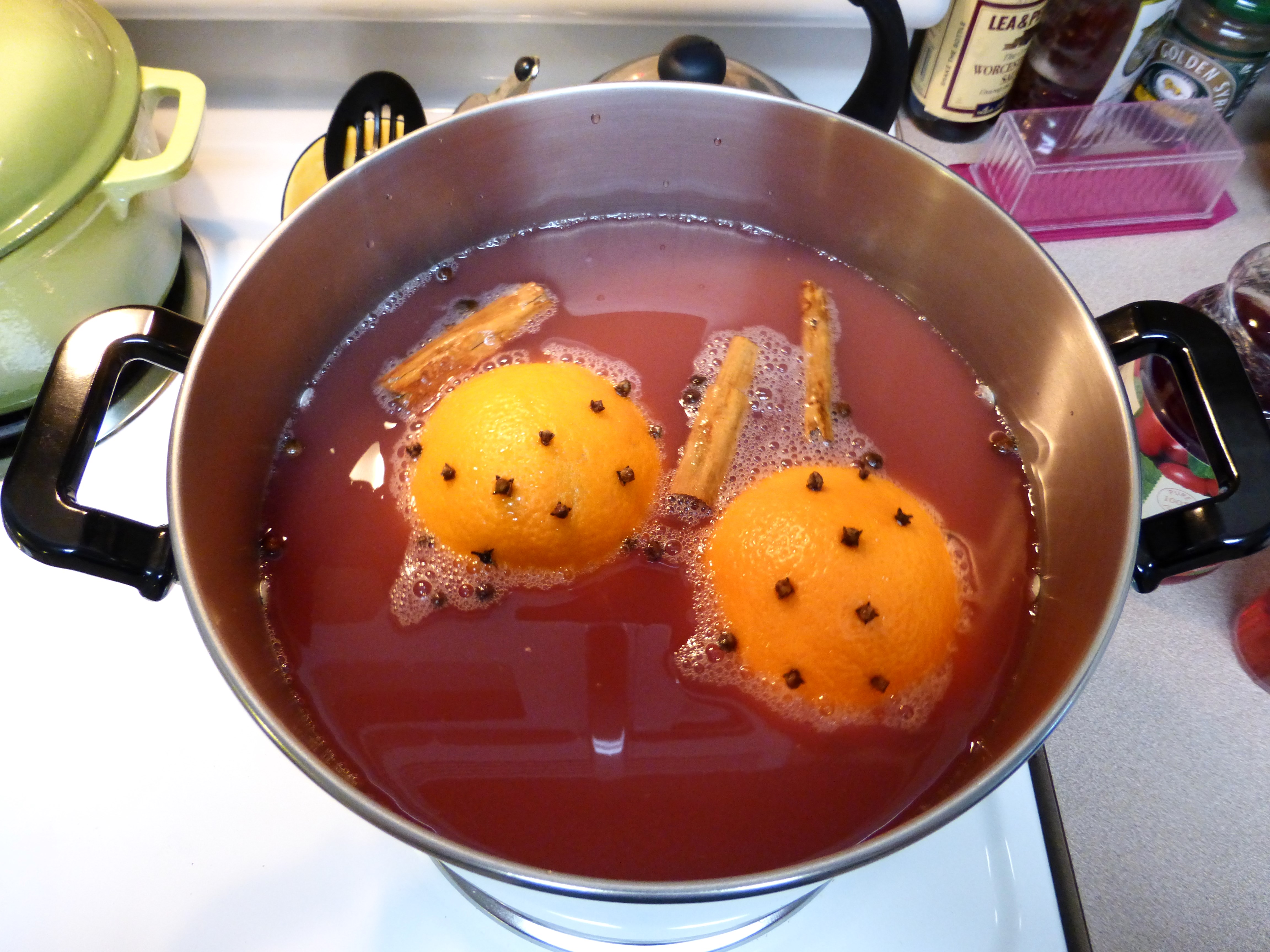 It wasn’t especially cold that day, but I’d thought it would be, so I made a hot wassail that I could serve both spiked and un-spiked. Thankfully, I’d had a terrific wassail a year ago at a Christmas party, so I emailed Kaye and pleaded asked her to share her recipe. Here is what she sent me: