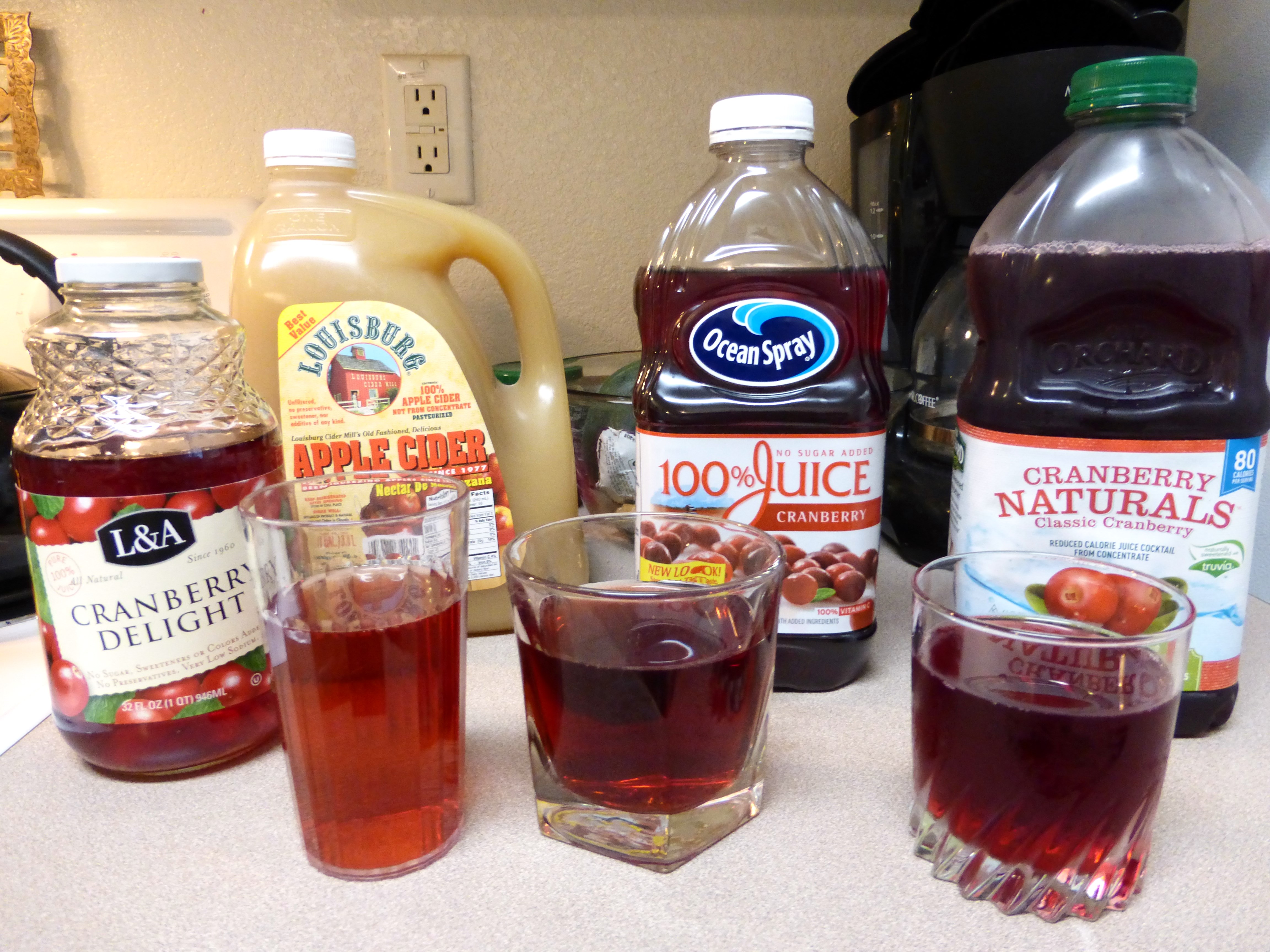 One note on cranberry juices: I bought three brands to try: L&A, Ocean Spray, and Cranberry Naturals. L&A contains apple and cranberry juices, and to me tasted mostly like apple; I didn’t use it. The Ocean Spray contains cranberry, grape, apple, and pear juices, and was more tart than the L&A but was still pretty apple-y. Nonetheless, it went into the pot. The Cranberry Naturals was my favorite; it contains only cranberry juice, and was just as tart at the Ocean Spray, but was also less sweet. I know those sound like obvious opposites, but it really wasn’t, it really tasted not more tart, just less sweet, an almost clean taste I’d call it. It was quite good.