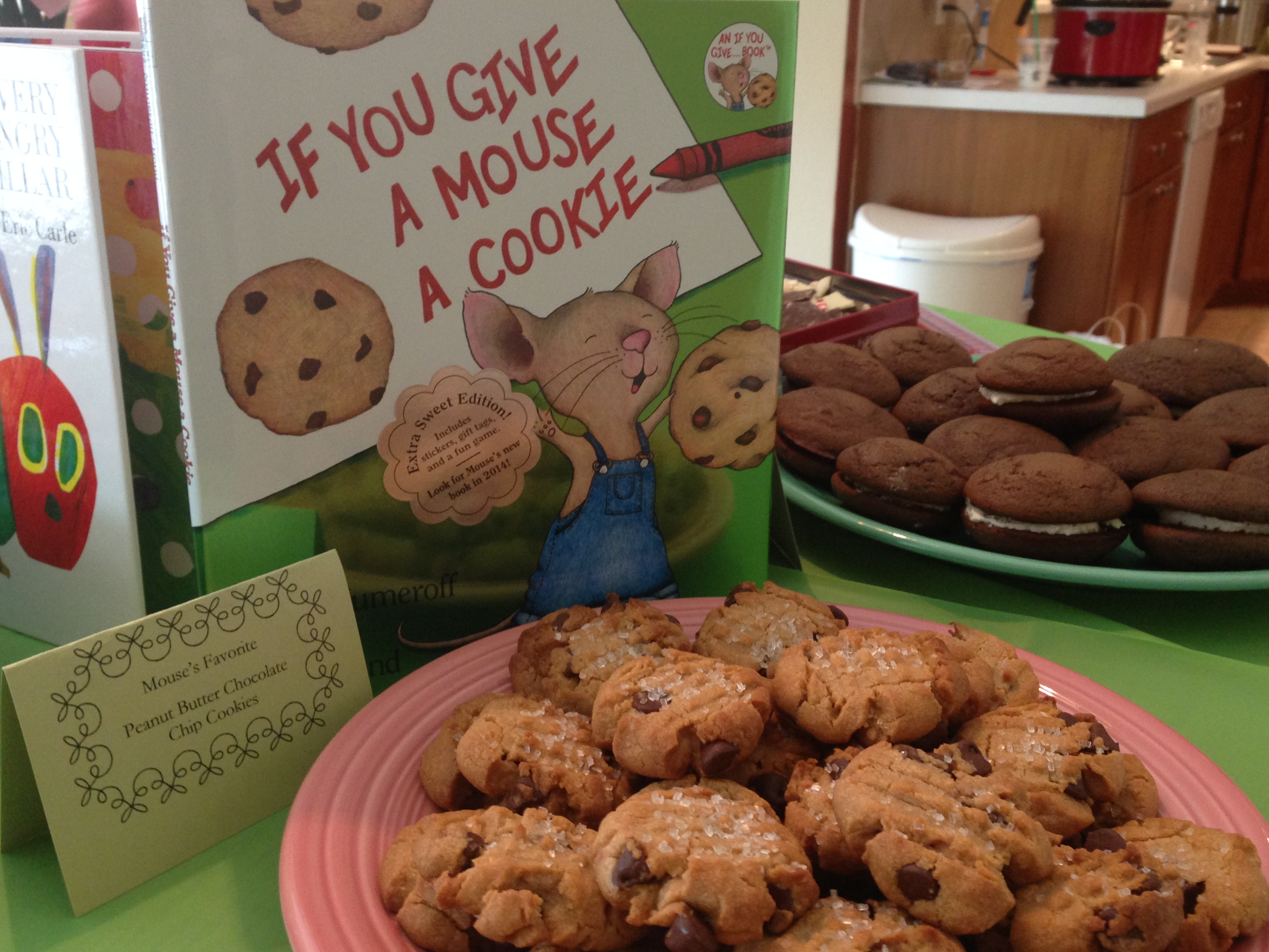 And I made Green Eggs and Ham mini-quiches (no pictures, alas!), Cloudy with a Chance of Meatballs cocktail meatballs, and Peter Rabbit’s Veggie Tray with White Bean Dip: