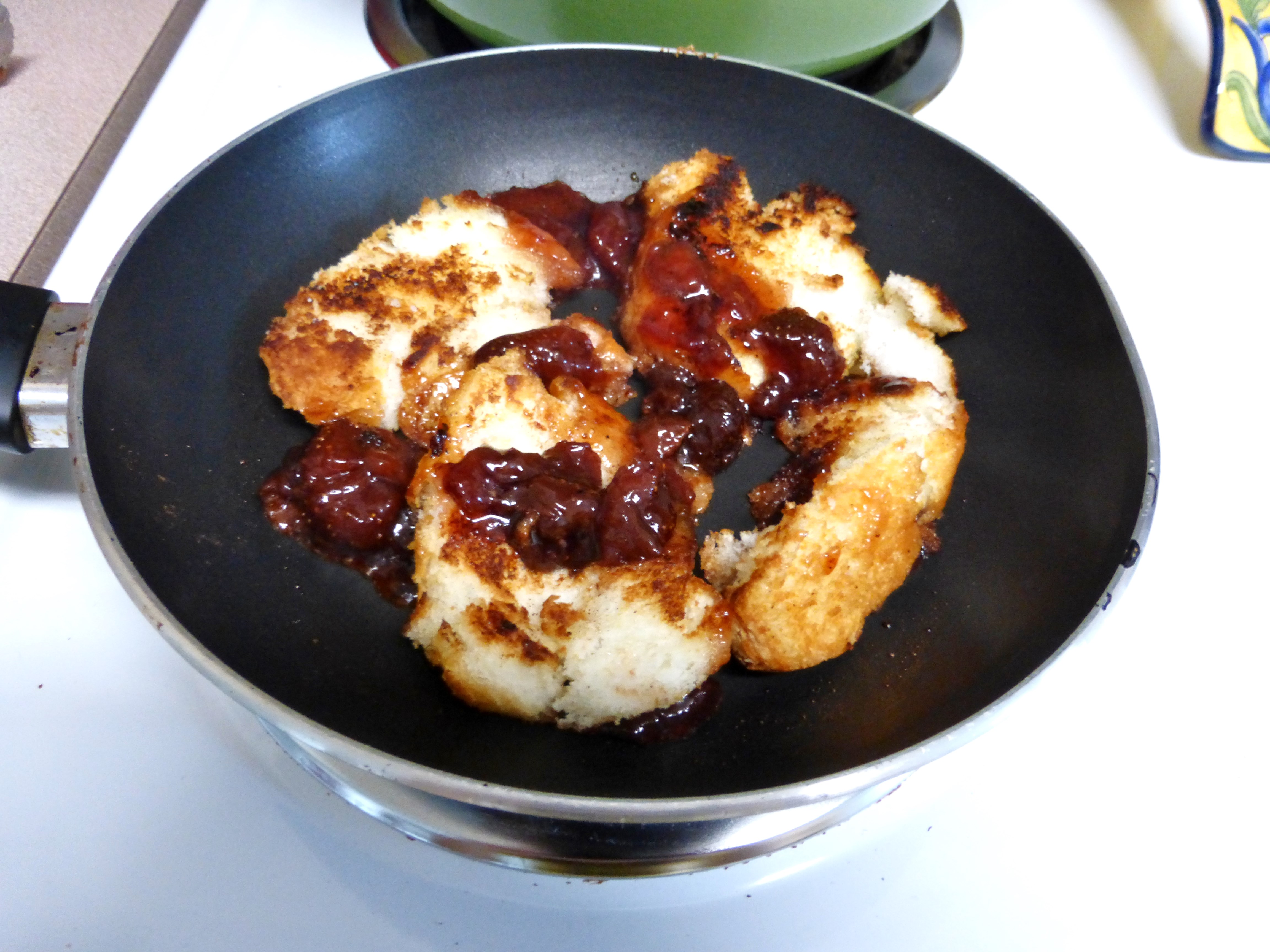 It worked like a freakin’ charm, Kaki. Oh my gosh, the outside caramelizes because duh, it’s cake not bread, so as it “toasts” you’re getting crispy, sticky, sugary goodness happening. And so quick! I nuked the frozen cake for thirty seconds, heated up a pat of butter in the pan, then let each side fry up for a minute and a half. In the last thirty seconds I added three spoonfuls of jam, which got all warm in the middle and all caramelized and sticky at the edges. Scoop it into a bowl and EAT!