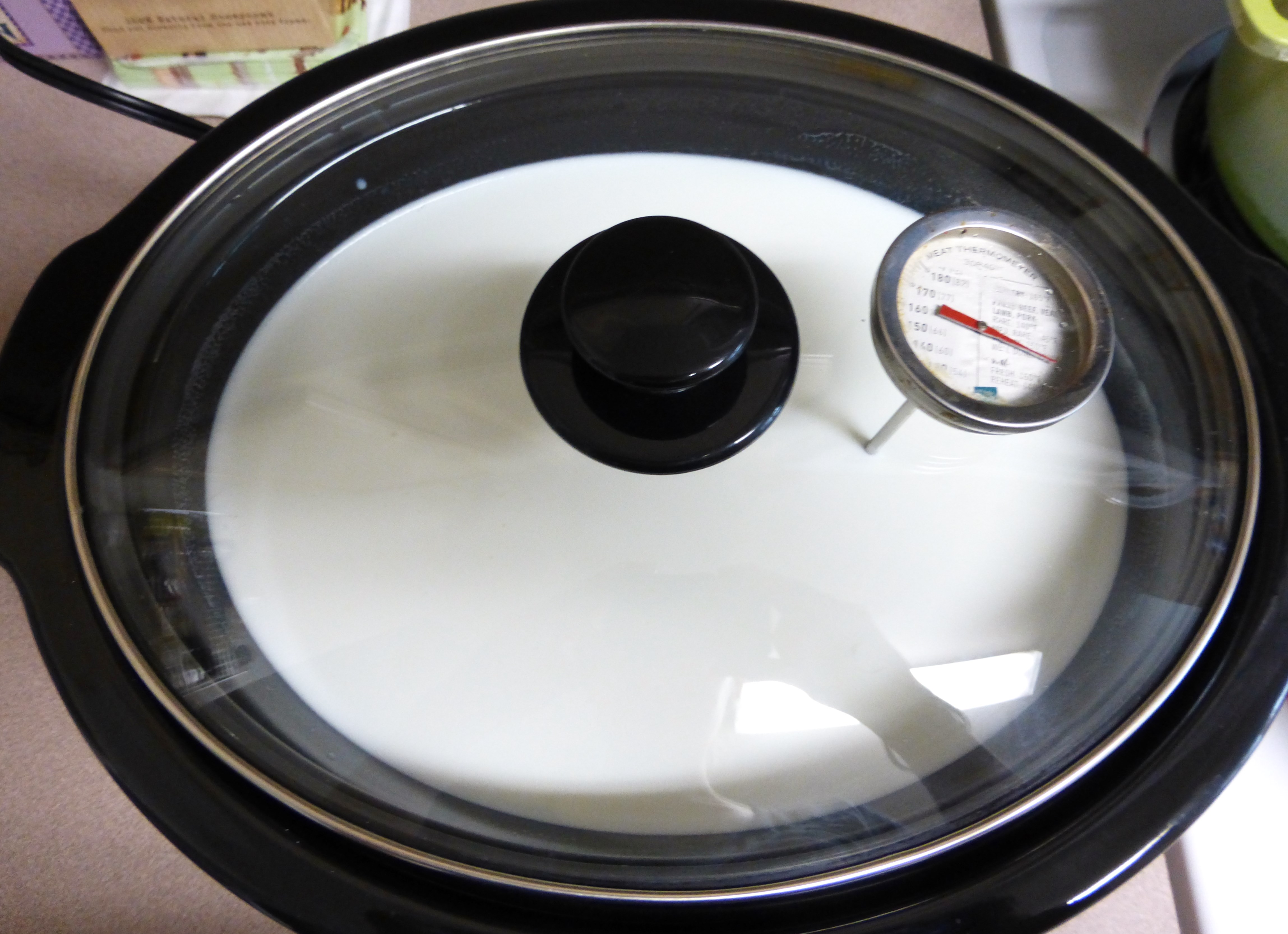 Cover the slow-cooker and insert the thermometer into the vent hole in the lid. Let the milk heat until it reaches 180*F.