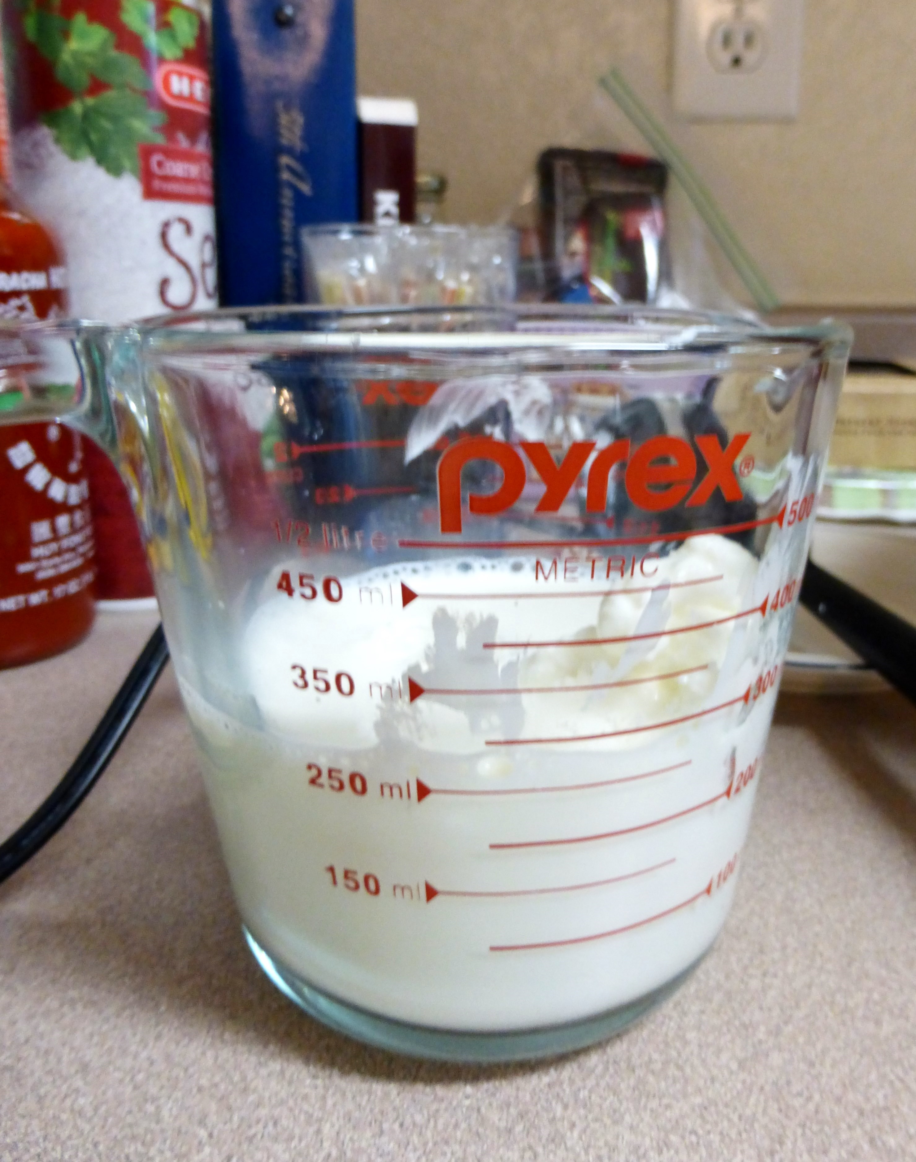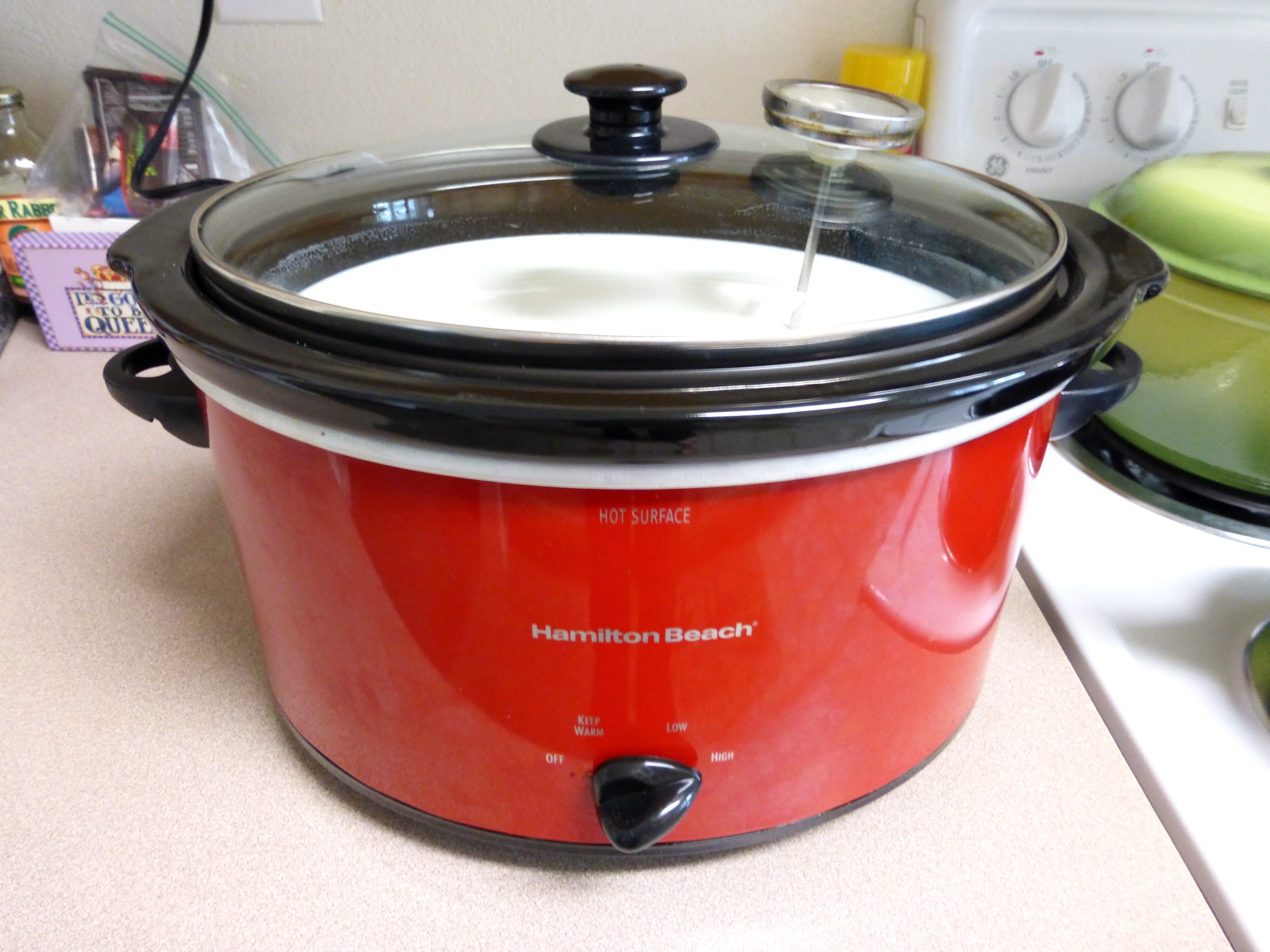 **Except I almost never actually start at 5:30pm. It’s usually an early afternoon thing, then I’m about to finish it all up before I realize, “Oh… I’m going to need to set an alarm tomorrow to wake up in time to put this darn yogurt in the fridge. Well. That’s not ideal.” I manage, certainly, but ugh, to set an alarm on a Sunday! No. Subtract between 16-18 hours from your normal Sunday wake-up time and start then and you will be a much happier yogurt-maker. Probably use 18 hours to start in case your slow-cooker warms more slowly than mine, so you’ll have a little extra time built in.