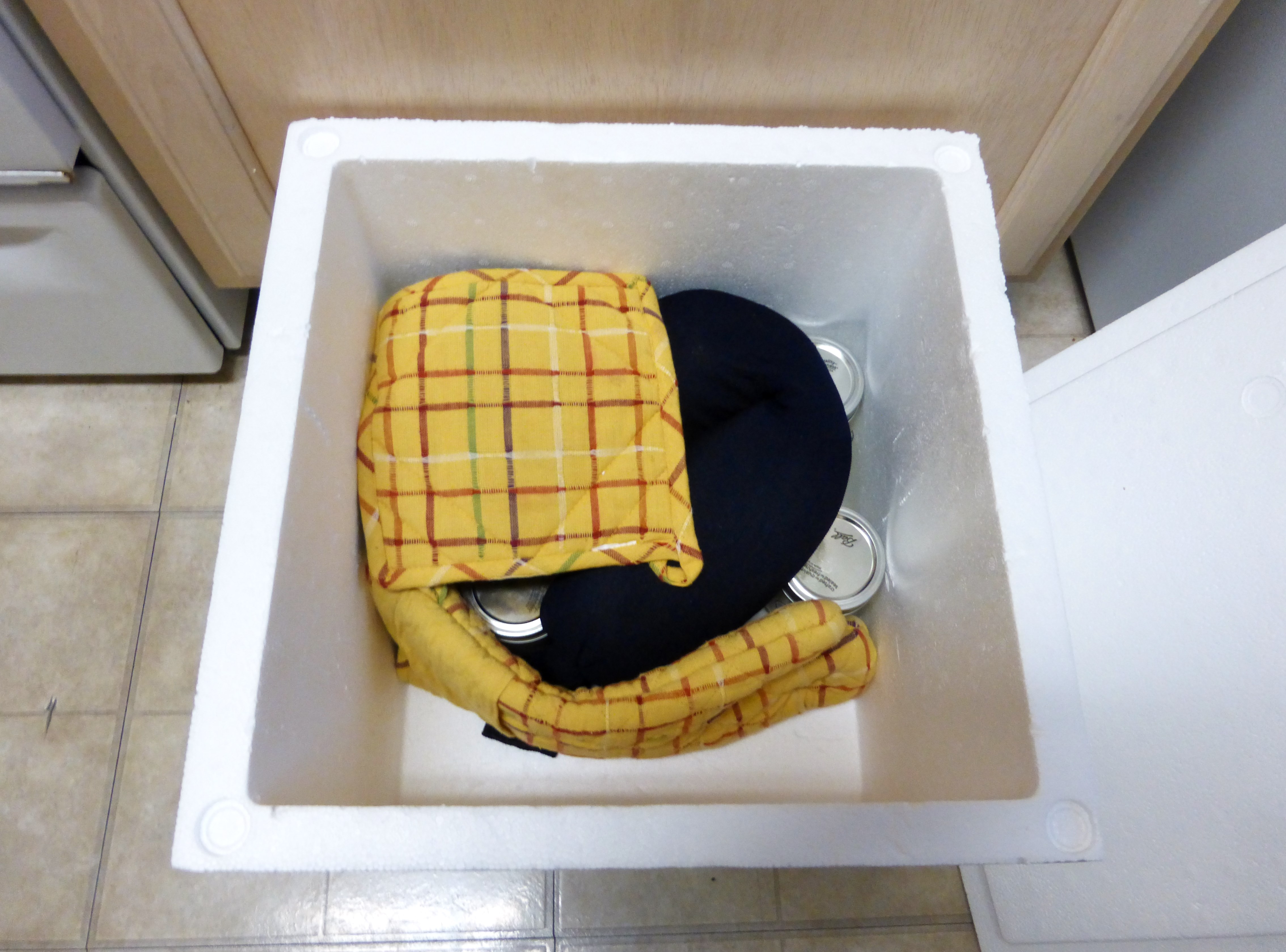 Pour the warm milk-and-yogurt mixture into the jars or tupperware that you’ll be using to store it. You’re going to need to let these containers culture for 12-14 hours in a warm place. Some people turn the light on in their ovens and keep their containers of yogurt in there. I’ve done this in the past and it works just fine. However this afternoon I was also baking, and so had to use another method: put your containers full of the warm milk-and-yogurt mixture into a large styrofoam cooler. Heat up a heating pad (mine is a neck pillow full of rice that you microwave to heat, it’s great) and put that on top of the containers. Insulate the rest of the containers with any oven mits you have available.
