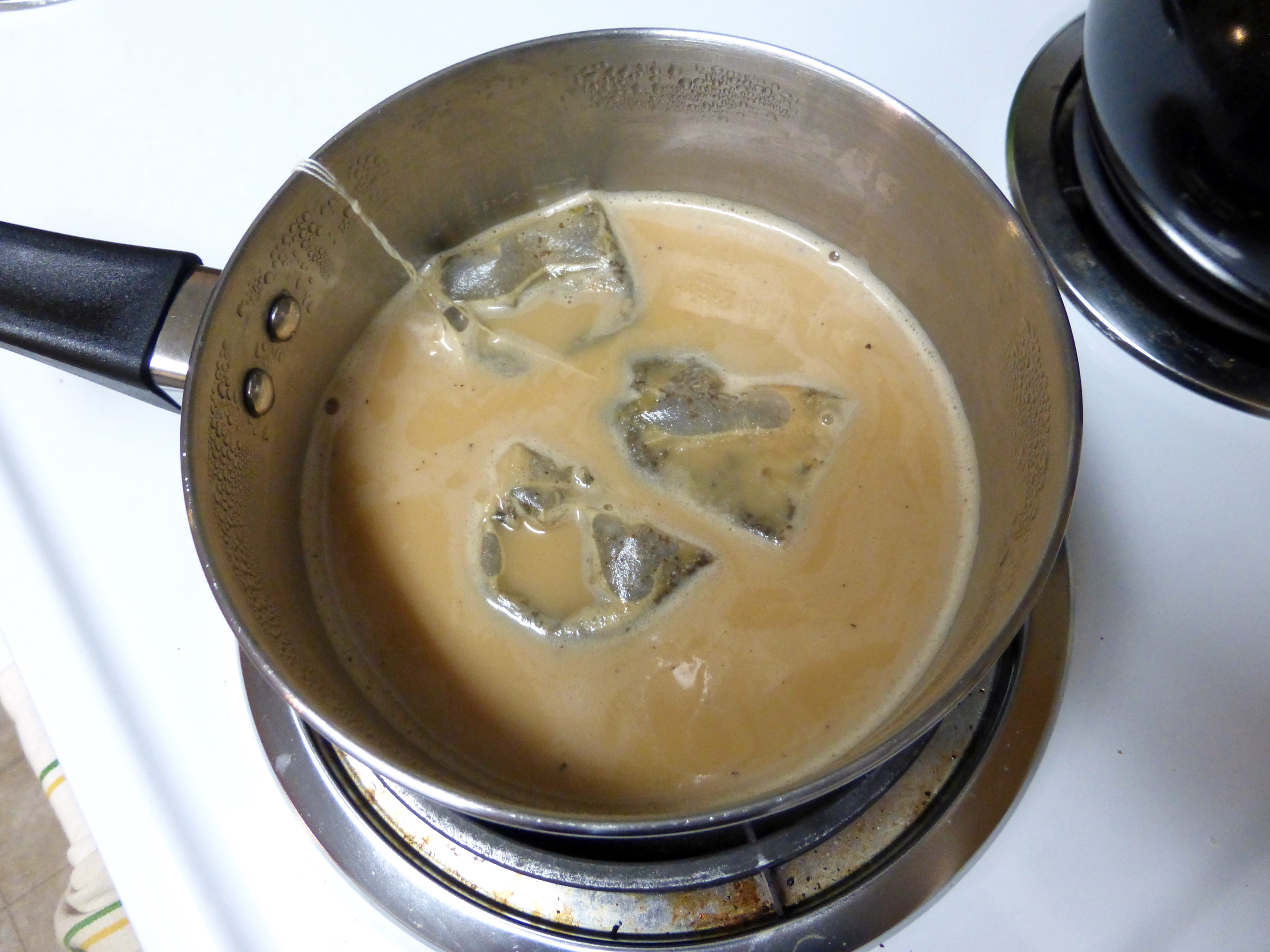 *Be gentle when you’re poking the tea bags to make sure they’re steeping thoroughly. Because otherwise one is going to pop open and you’re going to have tea leaf specks floating in your milk that you’ll have to strain out and it’ll be a regular pain.