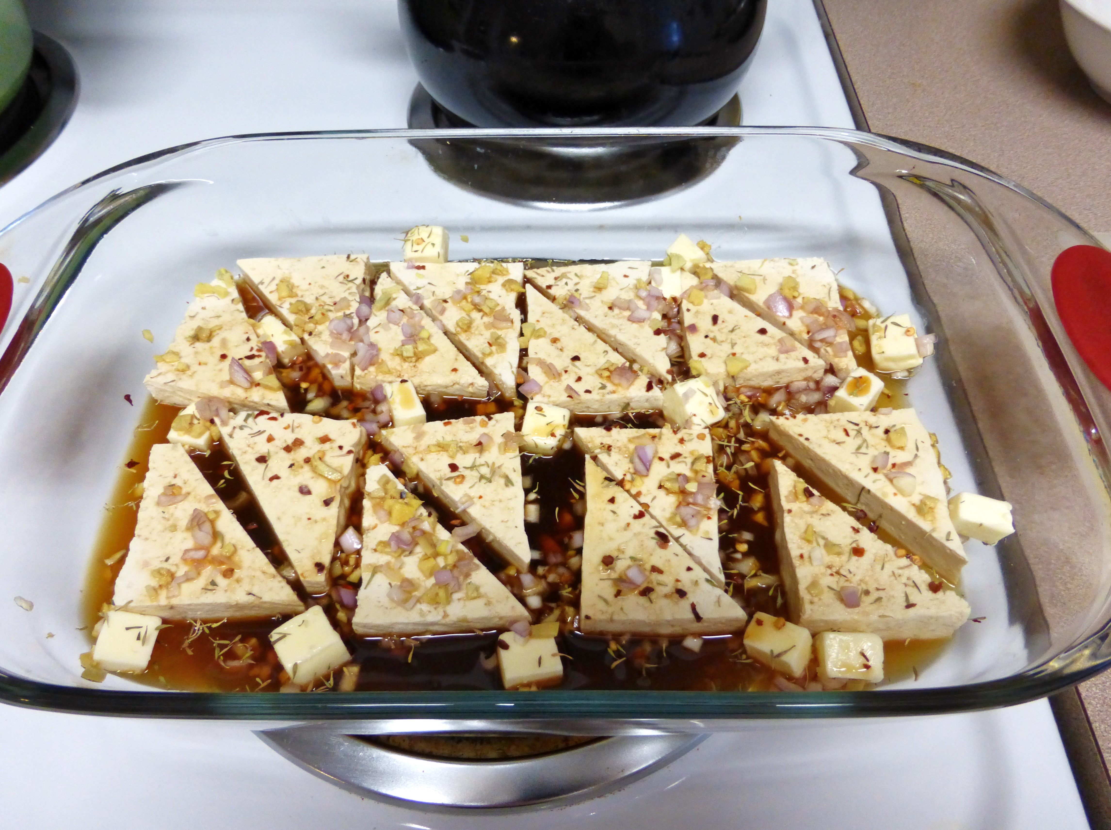 Remove the tofu from its container, draining away the liquid. Cut each block of tofu into four slabs, then cut those along the diagonal to form triangles. Lay your triangles of tofu in a 9×13 baking dish.