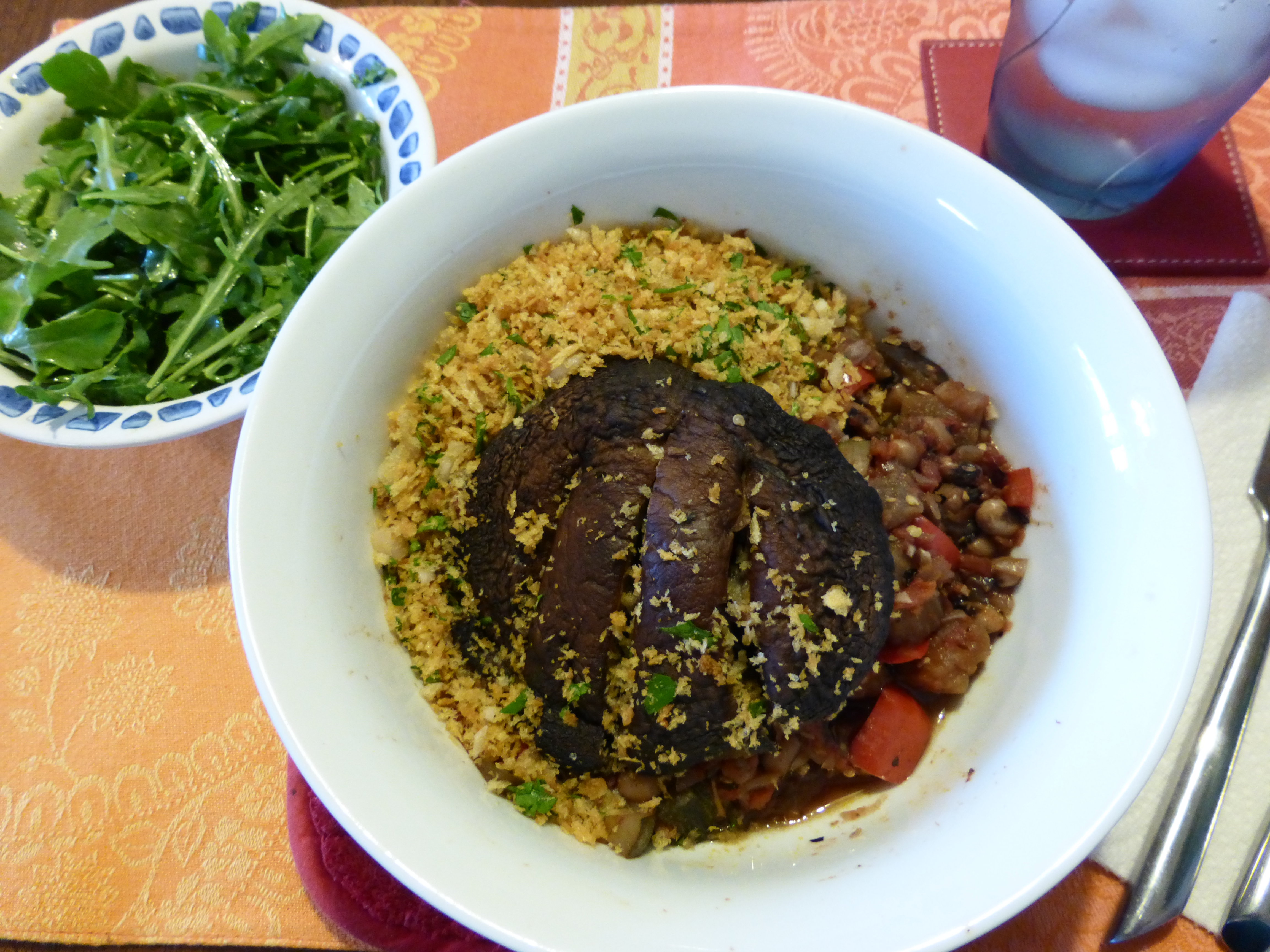 To assemble the dish: Slice each roasted mushroom into 4-5 strips and plate atop Summer Bean Ratatouille (will be its own post soon!). Drain the vinegar from the onion mixture. In a medium bowl, just before serving, combine the onion mixture with the chopped herbs, toasted breadcrumbs, and remaining 1/2 teaspoon salt. Sprinkle the breadcrumb salsa over the mushrooms.