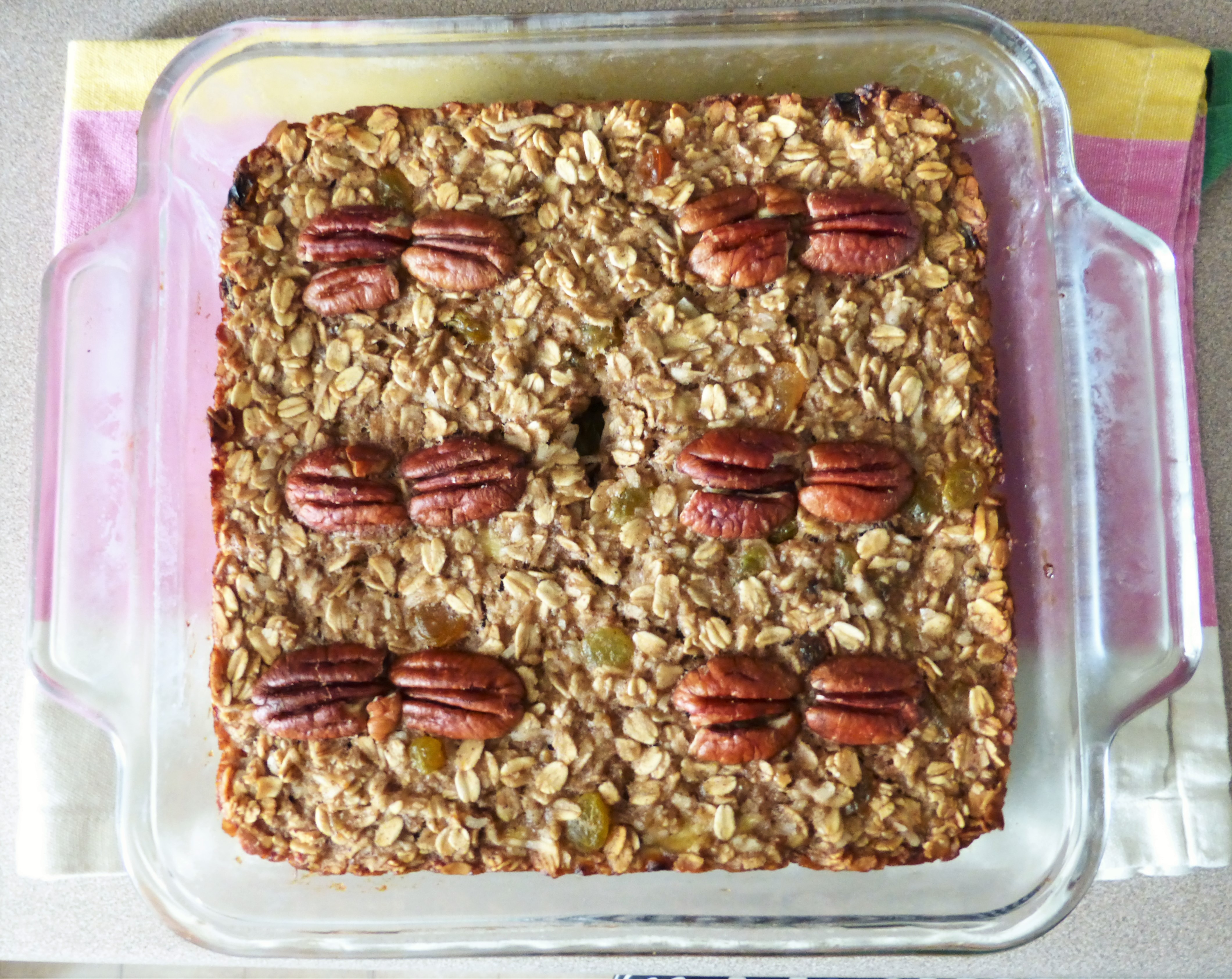 Pour oat mixture into prepared 8×8 dish. (Decorate the top with pecans, if you so desire.) Bake in pre-heated oven for 40-45 minutes.