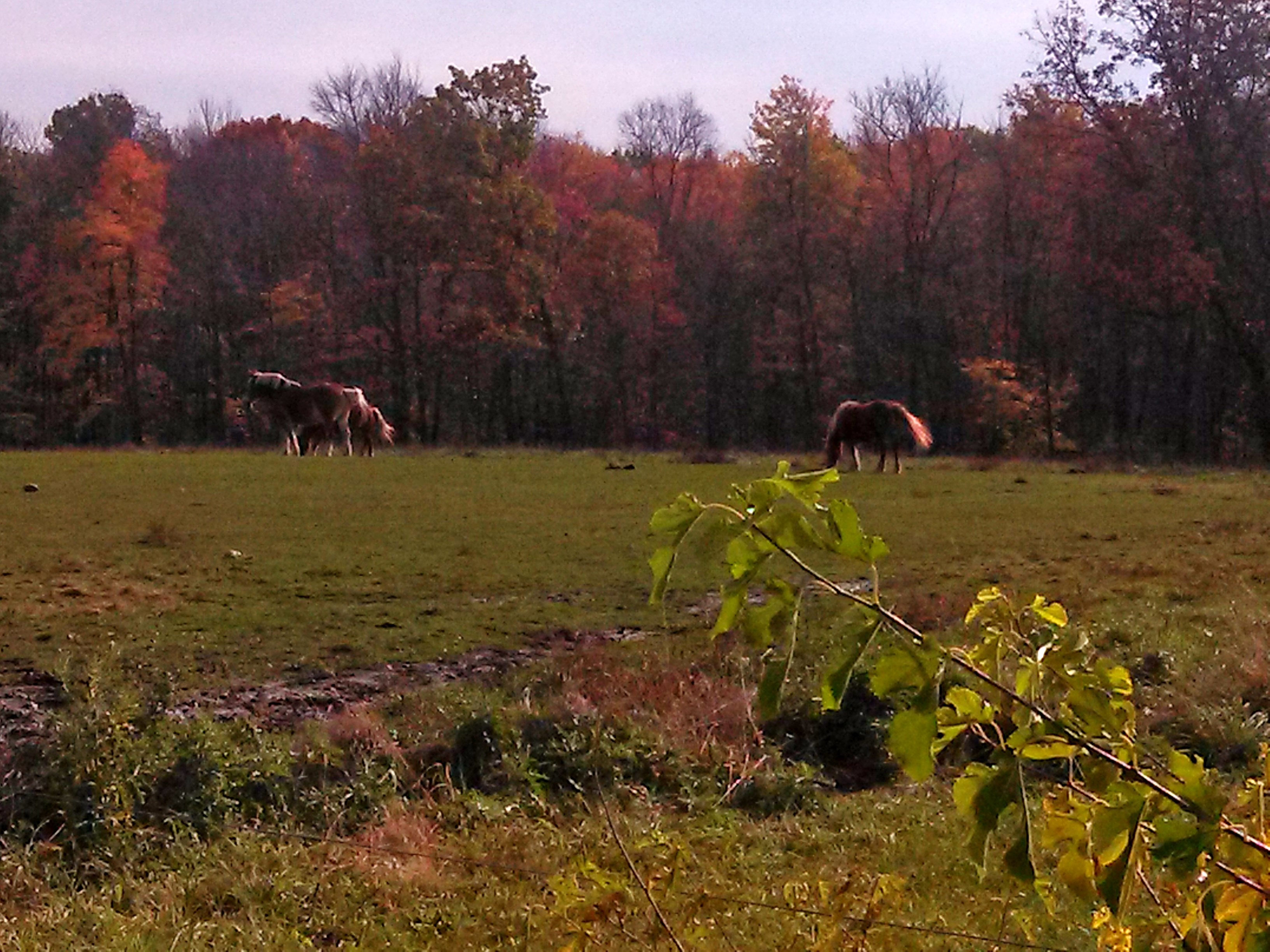 And here is a grainy phone camera distance shot of the horses and fall foliage that were just too picturesque not to attempt to capture: